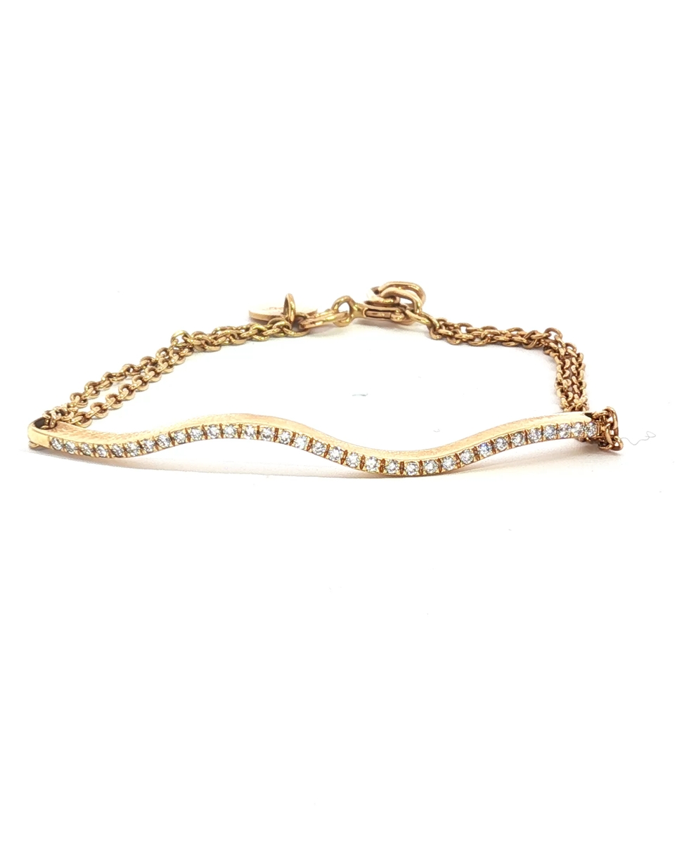 “Embrace minimalist elegance with this exquisite chain bracelet, masterfully crafted from radiant rose gold. Its delicate chain complements the meticulously set, round-cut diamonds that trace an artful design. The bracelet is a testament to understated luxury, perfect for adding a subtle sparkle to any ensemble.”