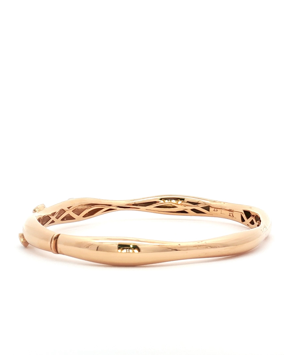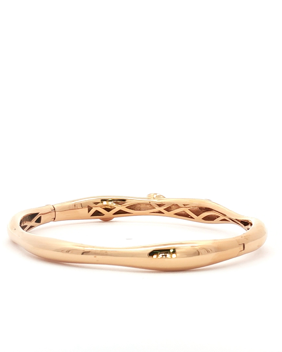 Indulge In The Understated Elegance Of This Rose Gold Bangle. The Smooth Lines Of The Bracelet Are Accented By Three Brilliant Cut Diamonds, Each Carefully Placed To Catch The Light. A Luxurious Expression Of Simple Beauty, Perfect For Everyday Sophistication.