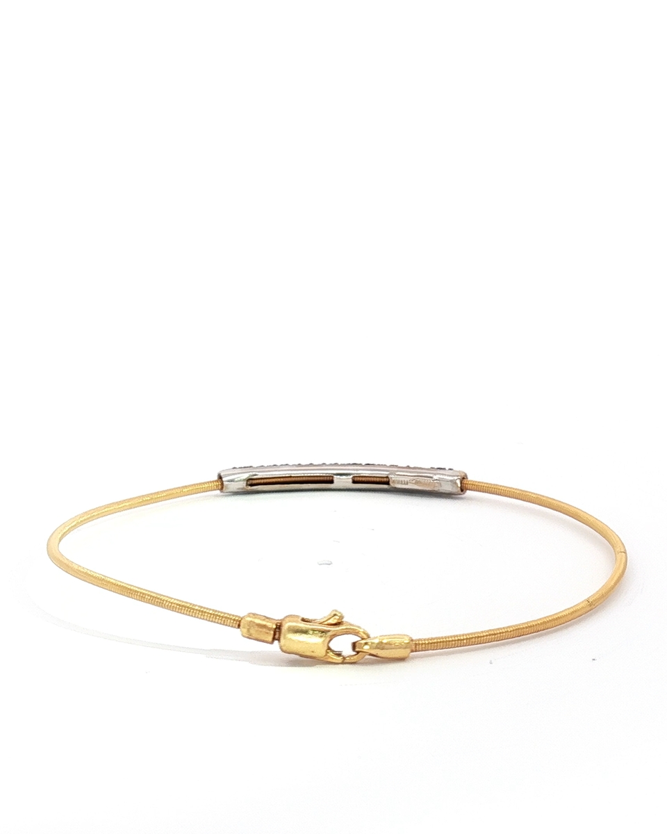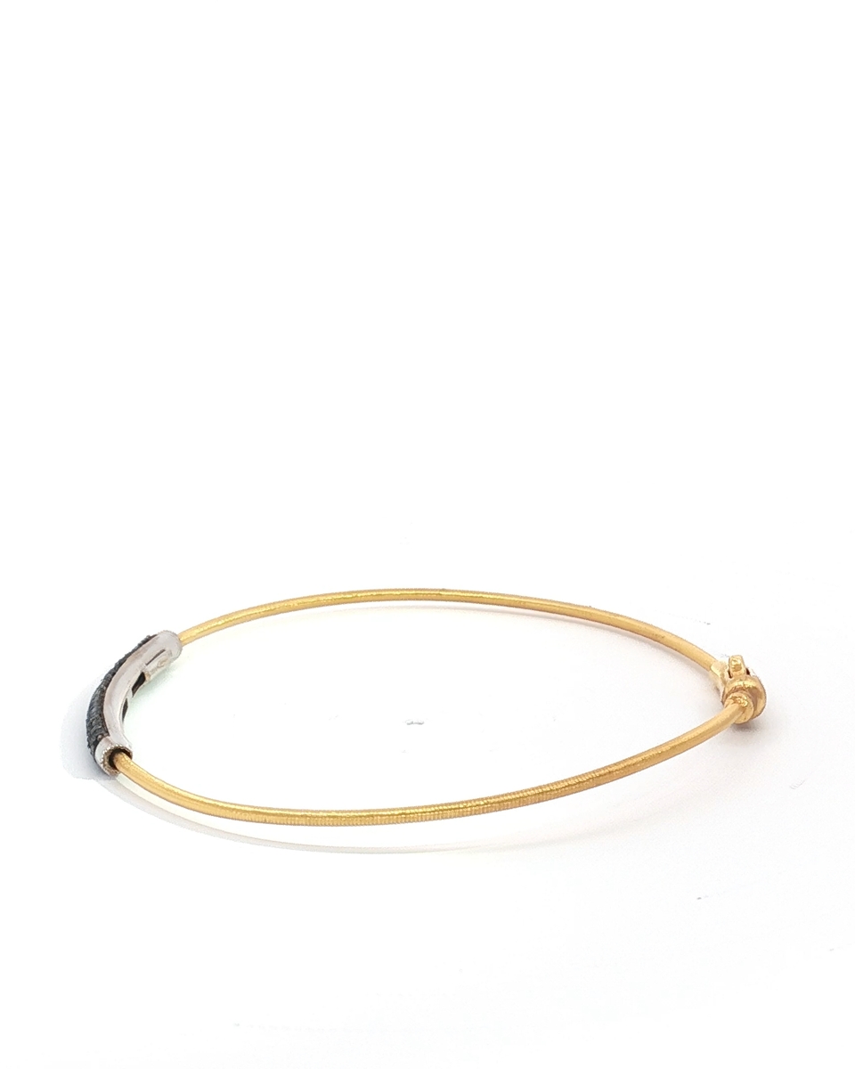 “Elevate your style with this exquisite bangle, crafted in radiant yellow gold. The sleek design features a row of meticulously set, round cut fancy black diamonds, creating a captivating contrast and adding a touch of modern sophistication to a timeless classic.”