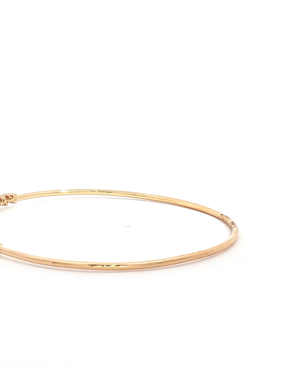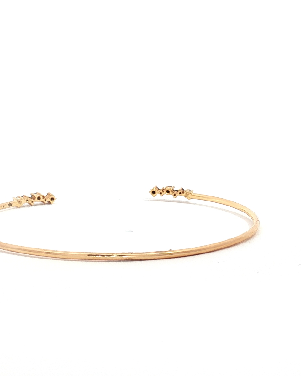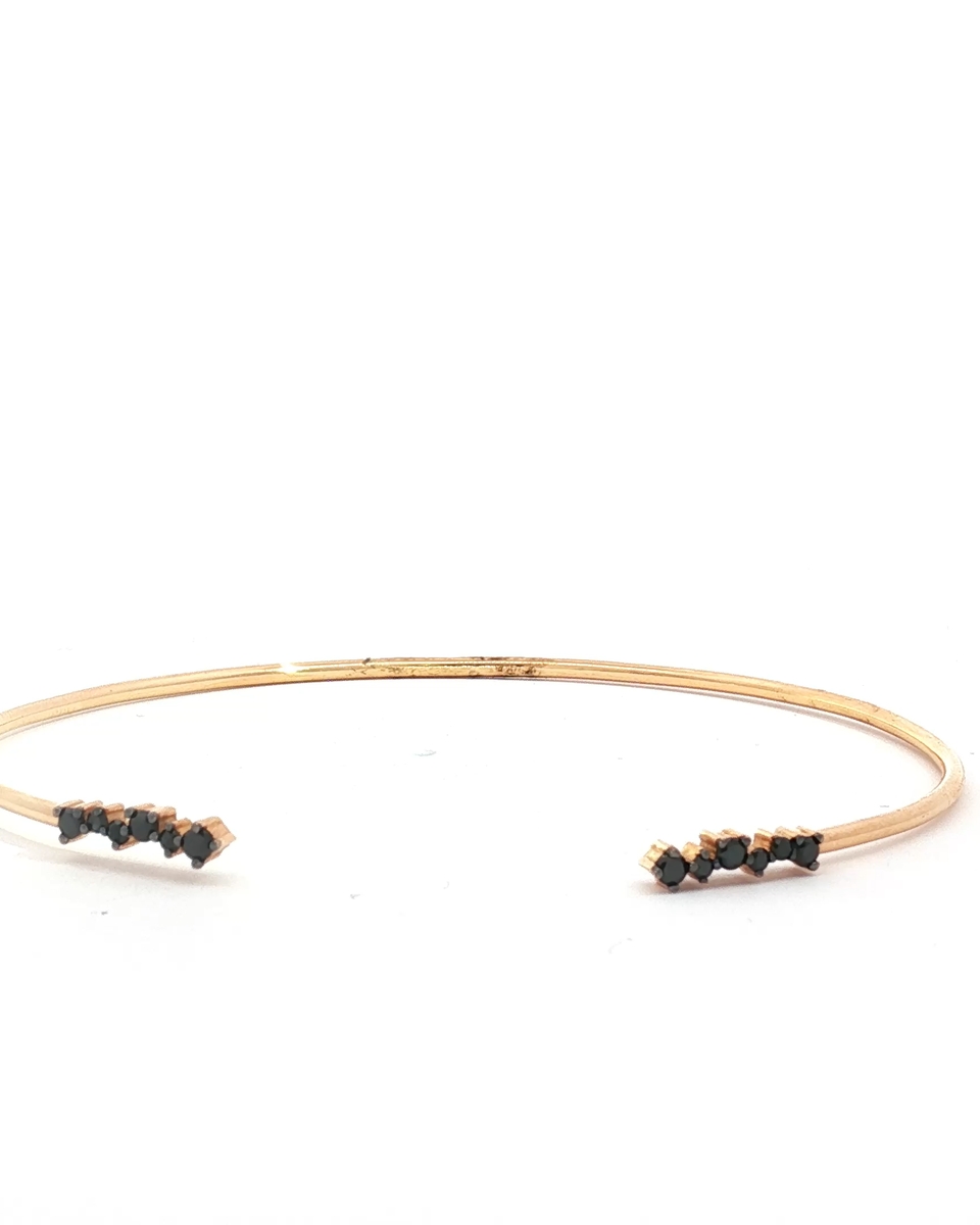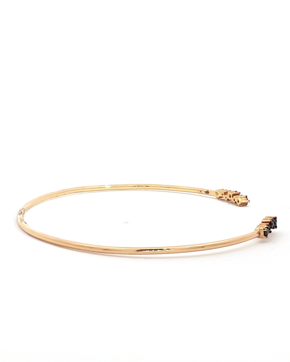 “Elevate your ensemble with this contemporary bangle. Crafted from radiant yellow gold, the piece features symmetrically arranged, square-cut black diamonds. Their fancy brilliance offers a bold contrast against the warm gold, culminating in a unique, statement-making design.”