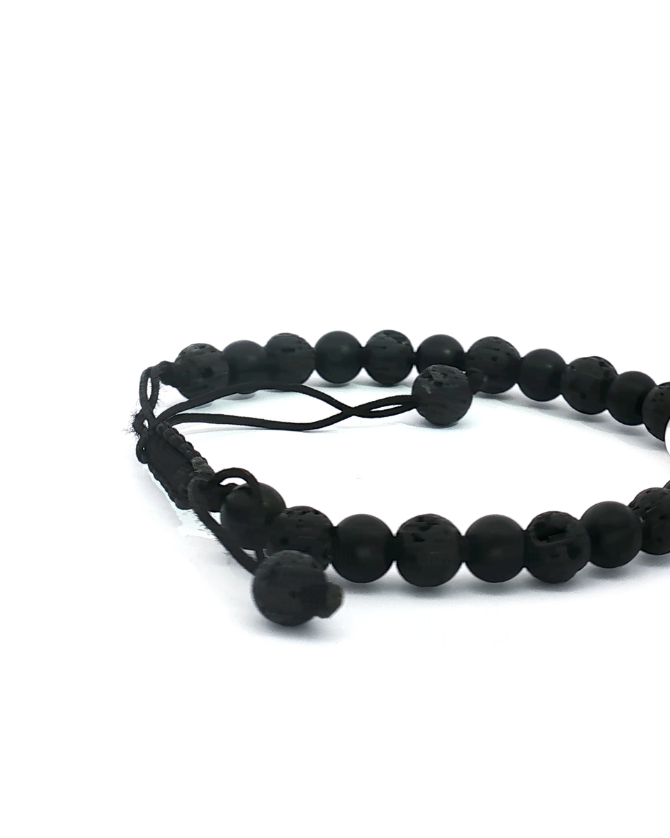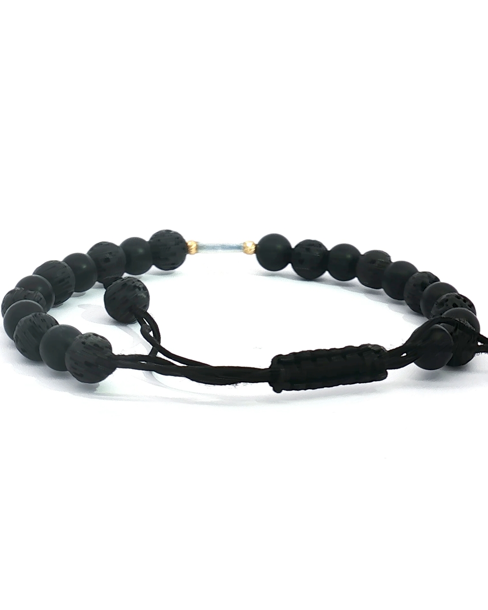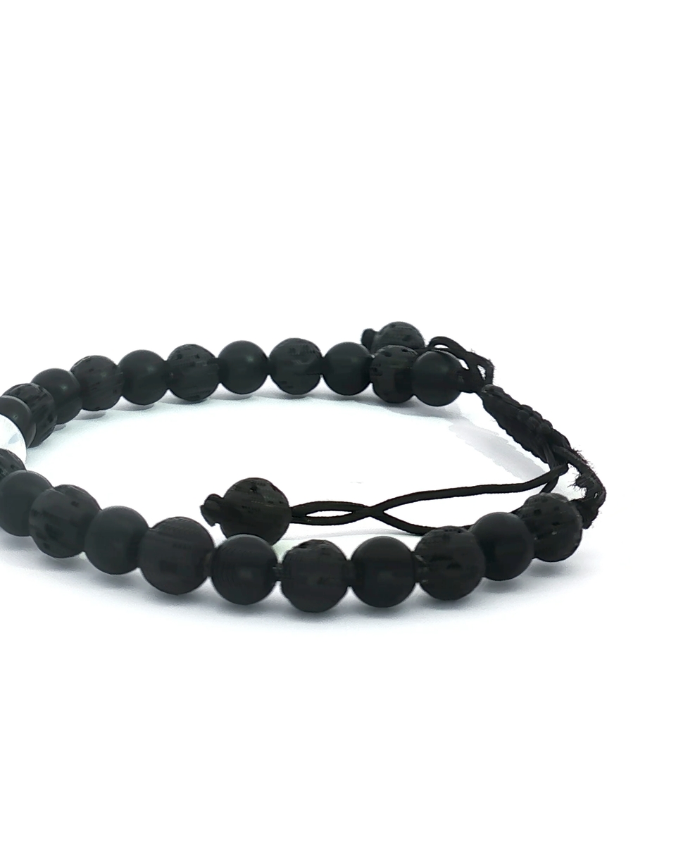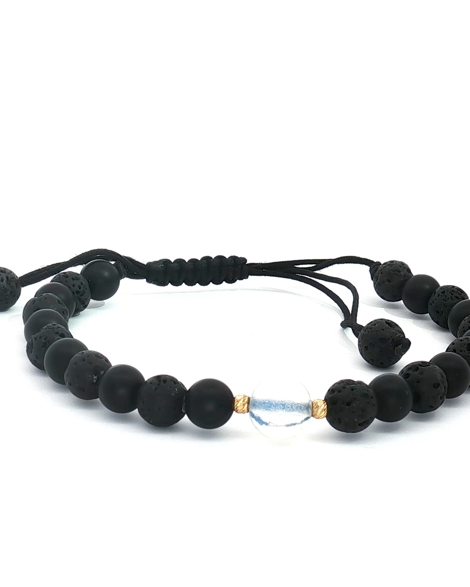 “Enhance your personal style with this striking beaded bracelet. It showcases round, cabochon cut quartz beads of colorless tone set with yellow gold color accents strung together with matte black beads. This unique bracelet is a bold statement piece that perfectly complements any ensemble.”