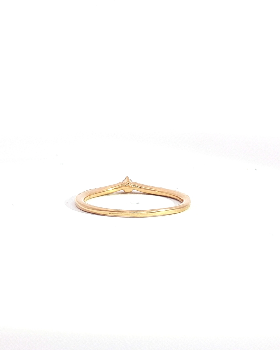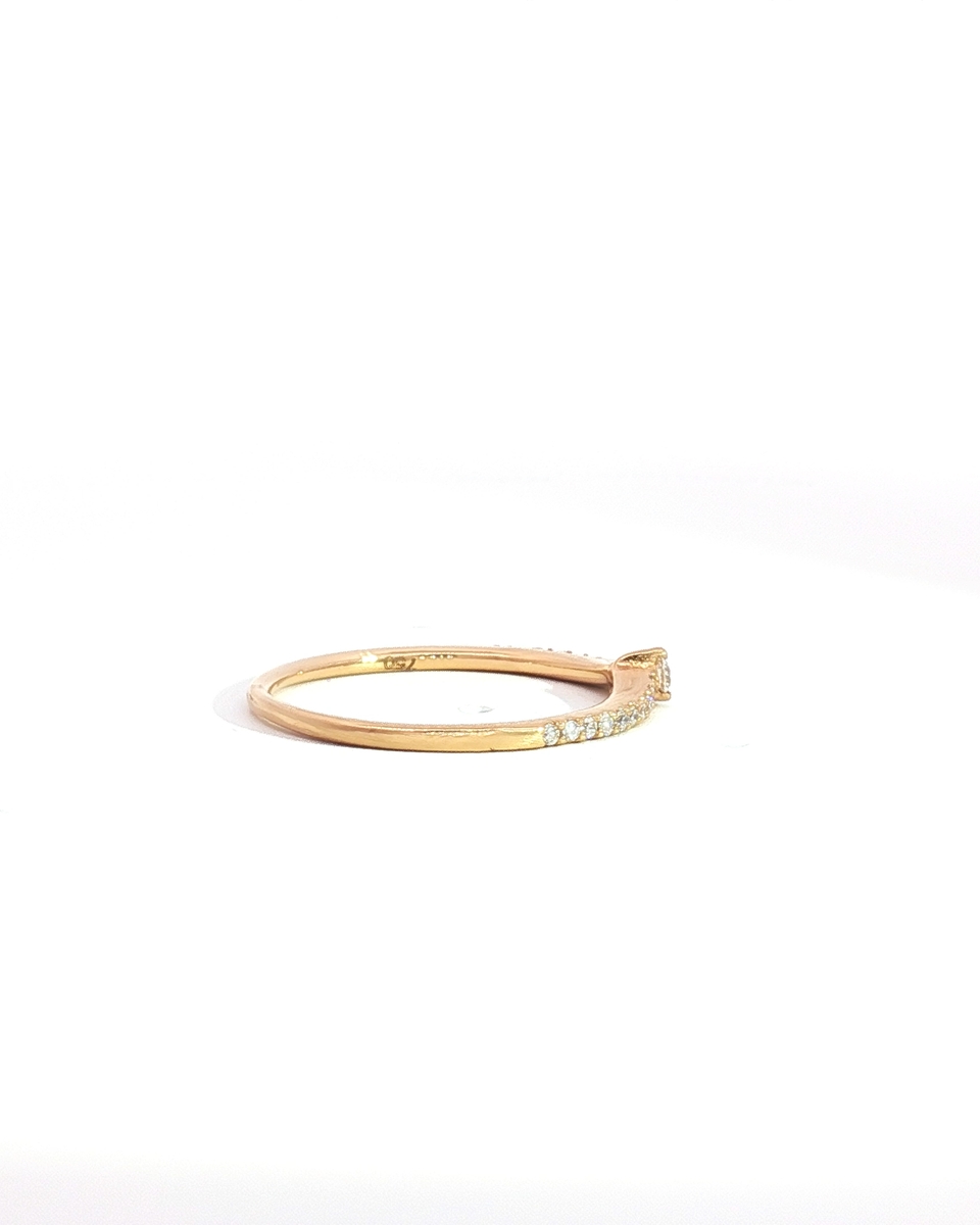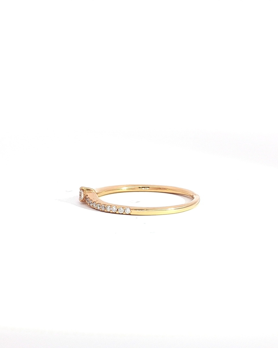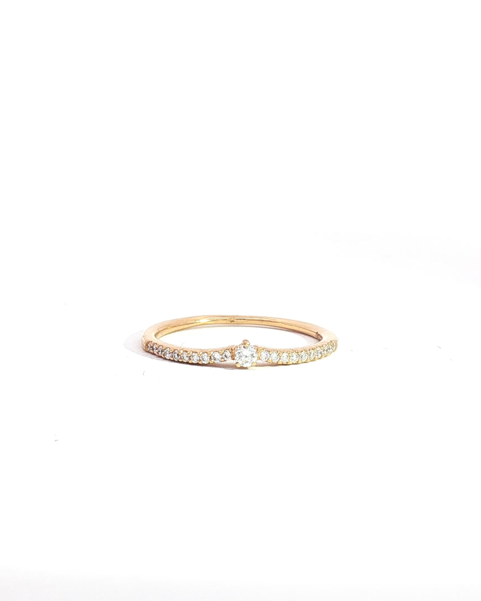 “Elegantly designed, this exquisite rose gold band ring features a delicate row of shimmering diamonds. Each round cut diamond is carefully set to maximize its brilliant sparkle. Crafted in lustrous rose gold, this timeless piece offers understated sophistication and effortless style, perfect for everyday wear or special occasions.”