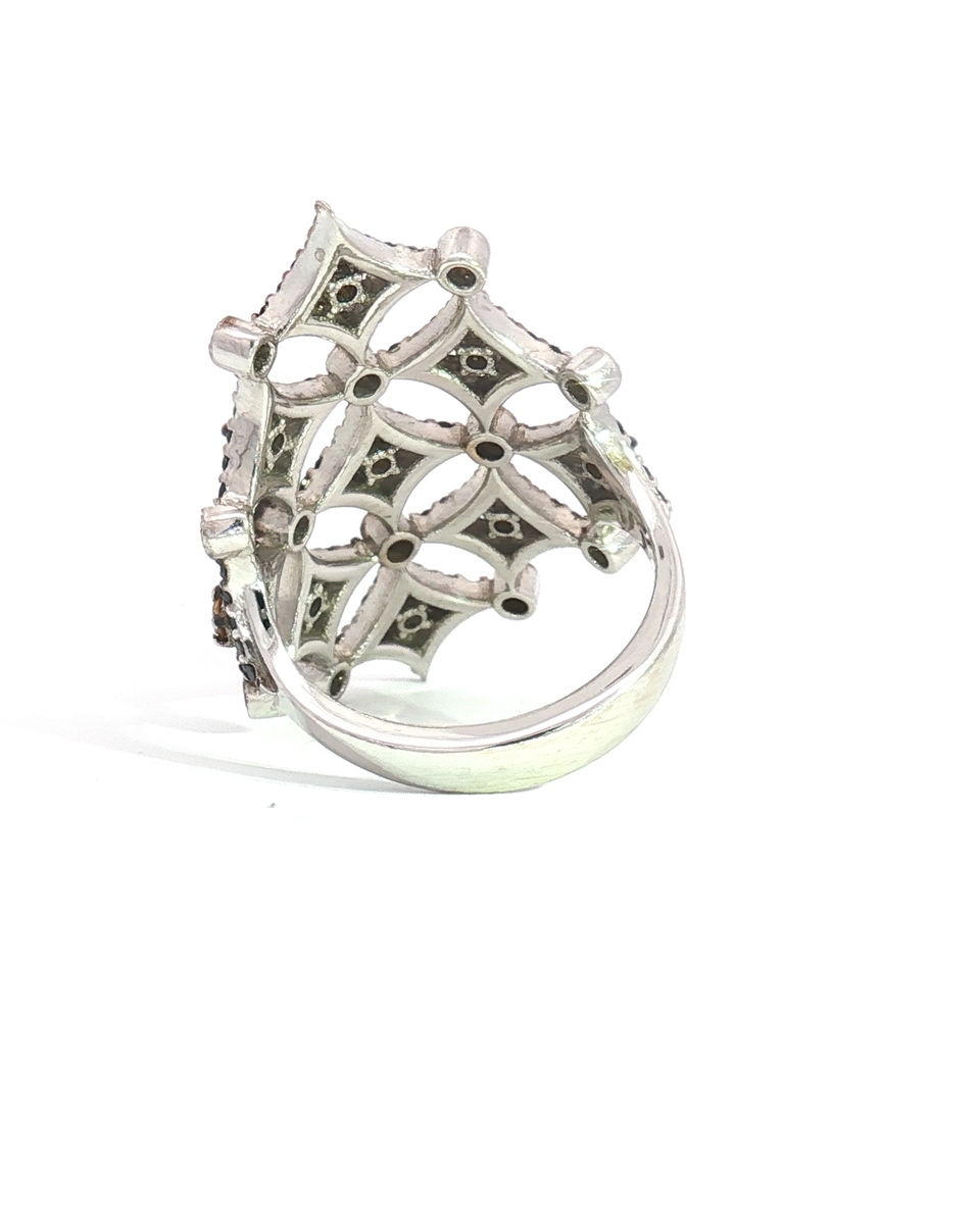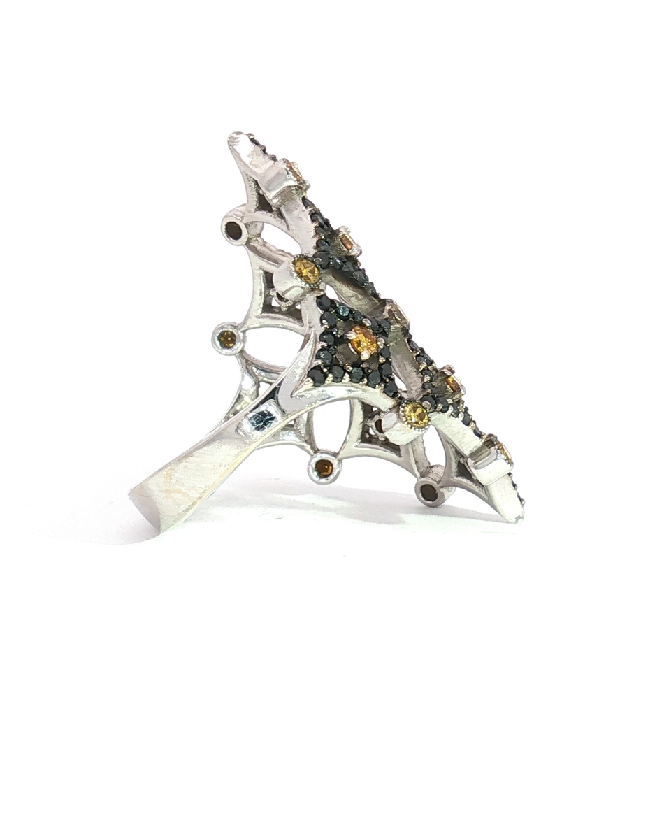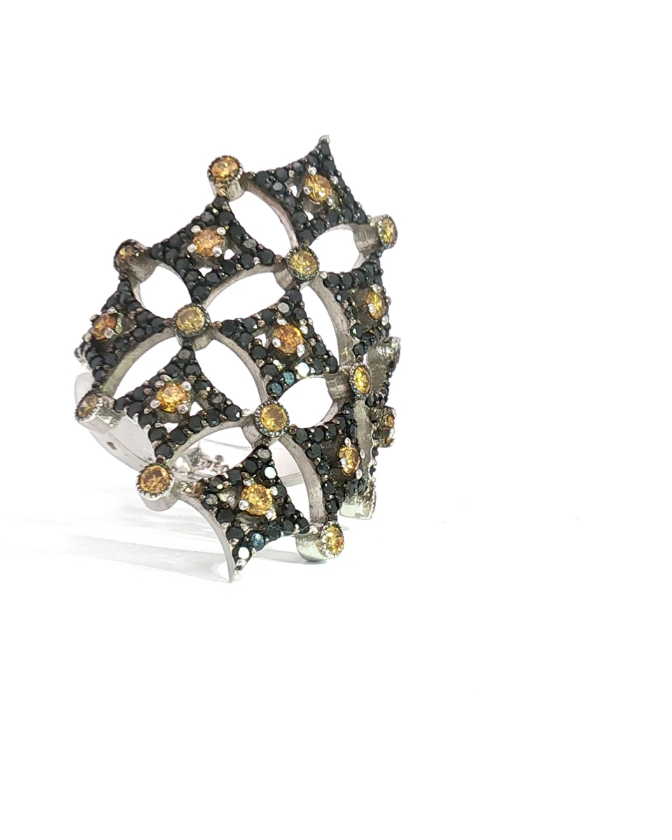 “Make a statement with this exquisite cocktail ring, crafted in lustrous white gold. The intricate design features an array of brilliant-cut, round shape fancy yellow diamonds, creating a dazzling display of light and color. A sophisticated piece for special occasions.”