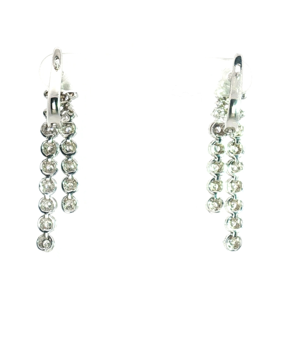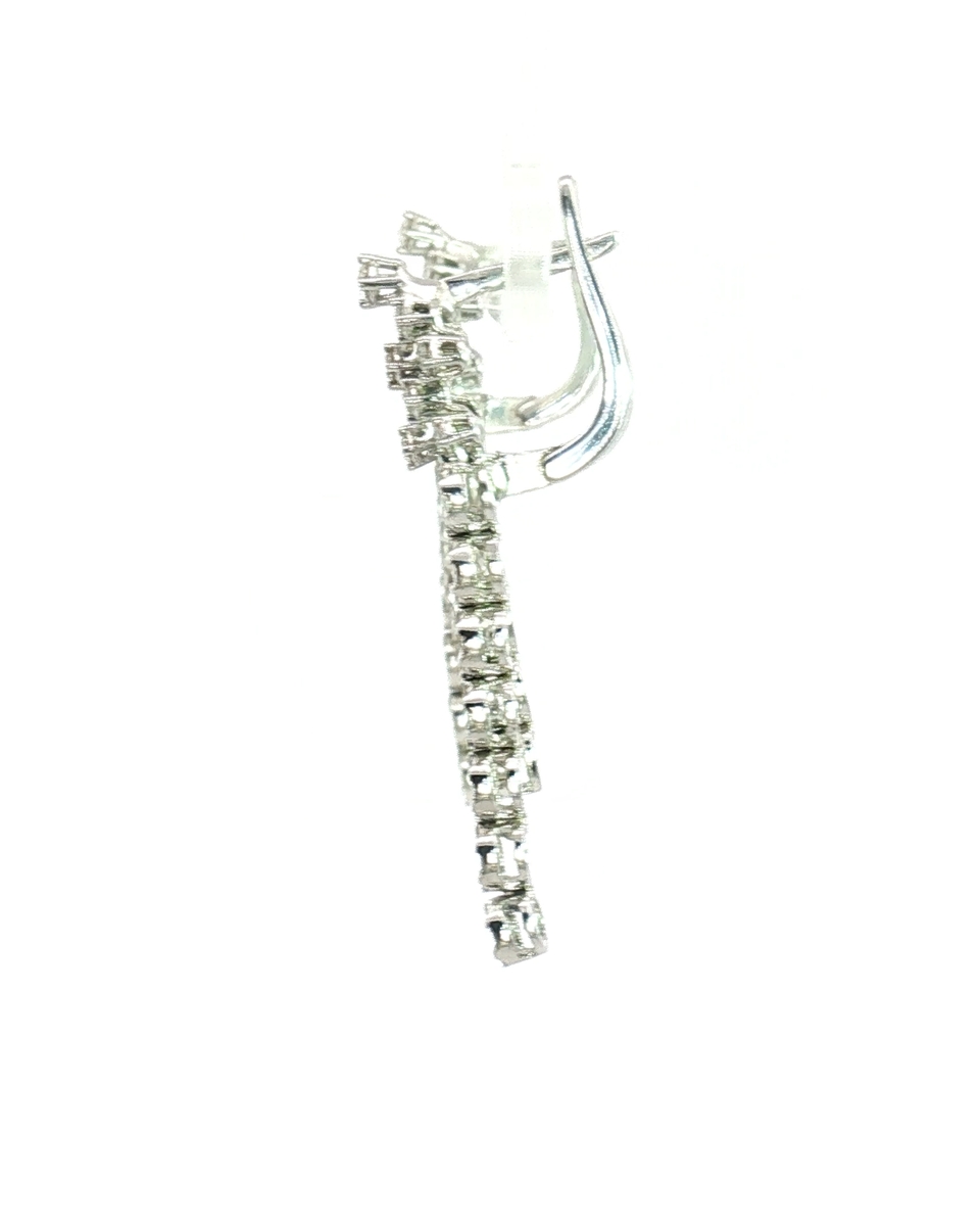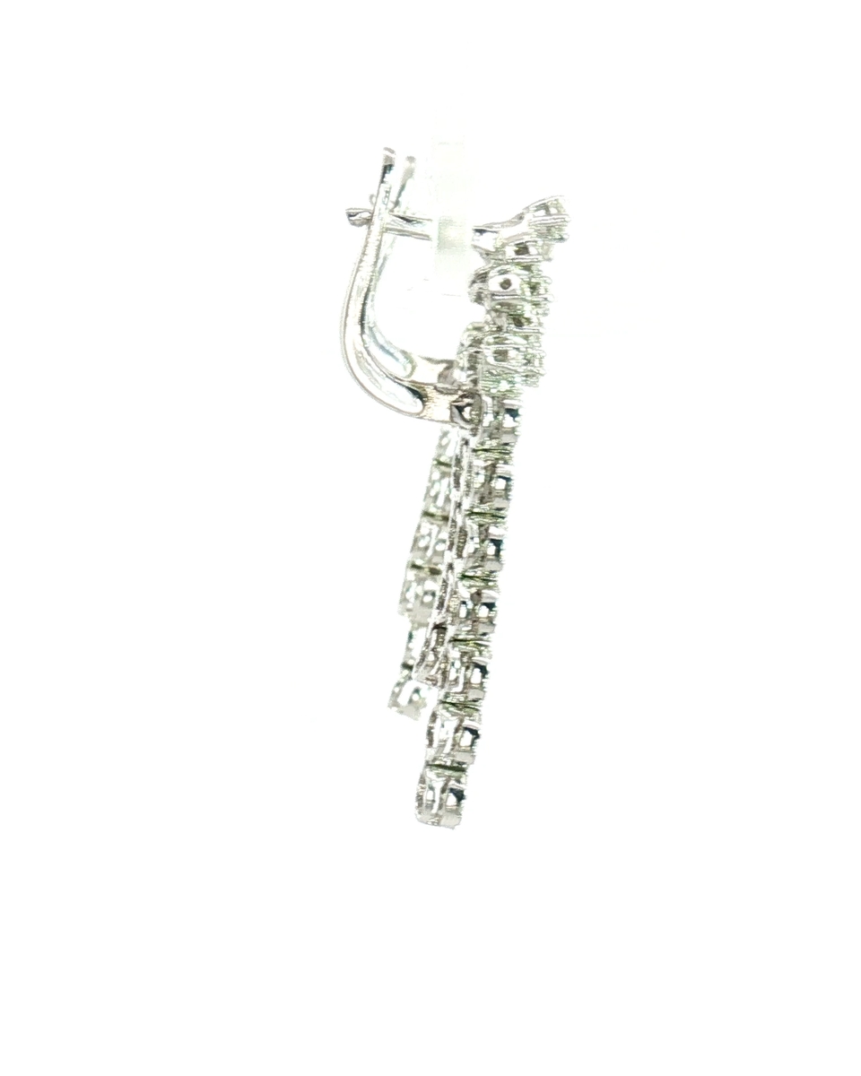 “Elevate your ensemble with these exquisite dangle earrings, crafted with white gold. Each earring showcases a cascade of round-cut, brilliant diamonds. The dazzling gems are meticulously arranged to maximize light reflection, offering a stunning display of fire and brilliance. These earrings add a touch of refined elegance to any occasion.”