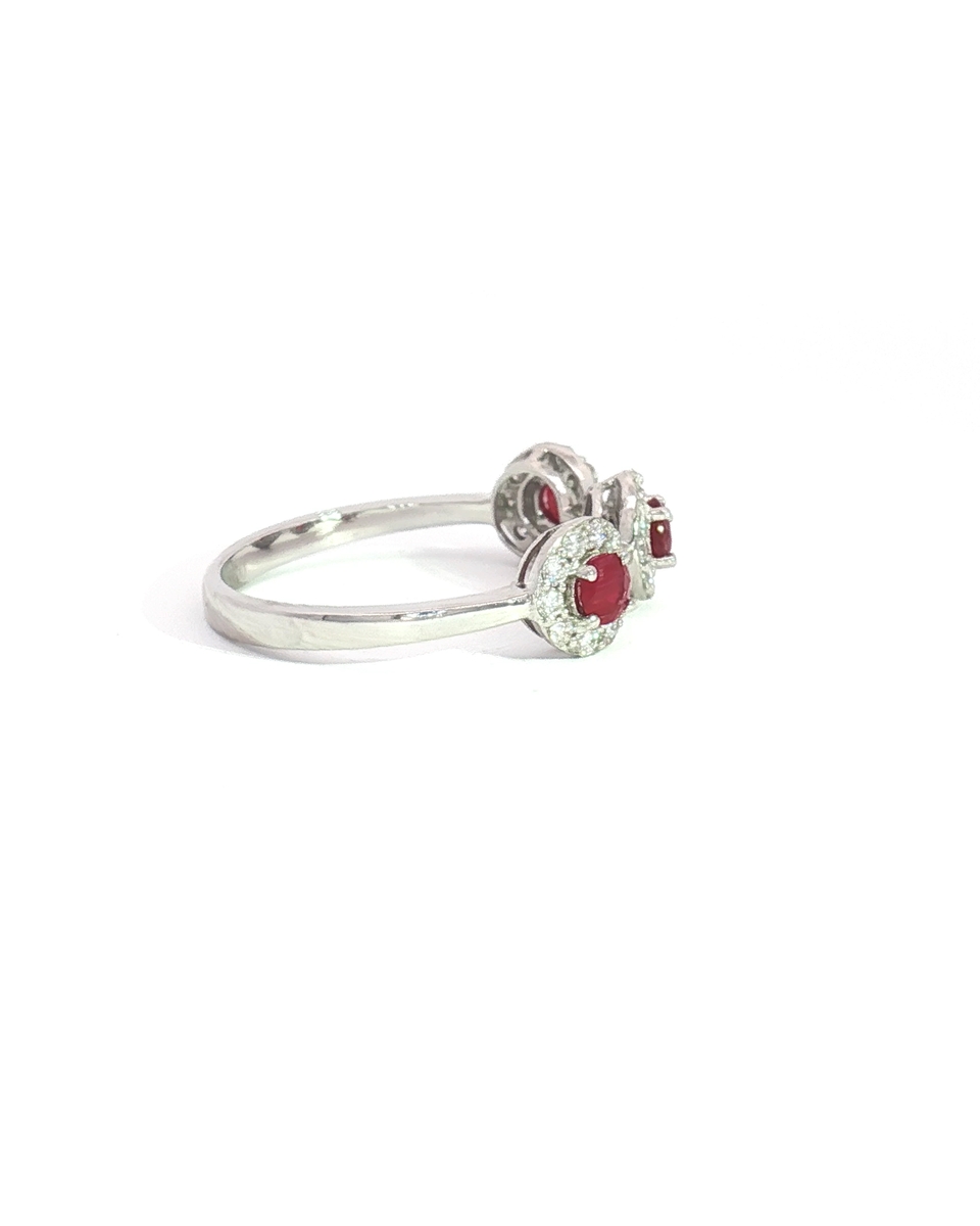 “Exquisite multistone ring crafted in white gold, featuring three vibrant round cut rubies, each exhibiting a brilliant cutting style. This sophisticated piece has a captivating red color. The gemstones are securely set, accentuating their transparency and overall symmetry, making it a luxurious addition to any fine jewelry collection.”