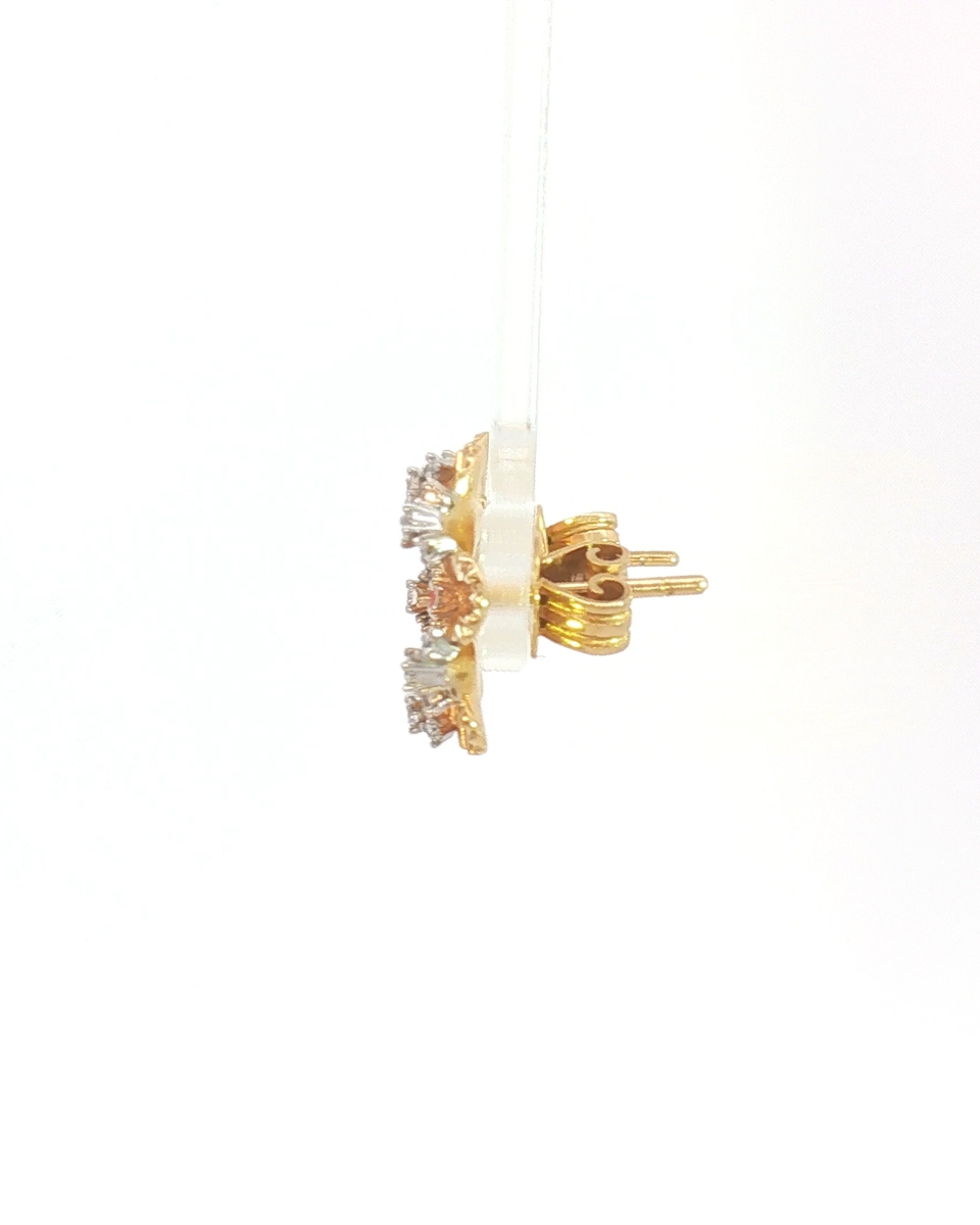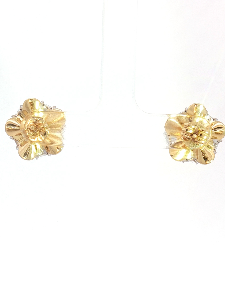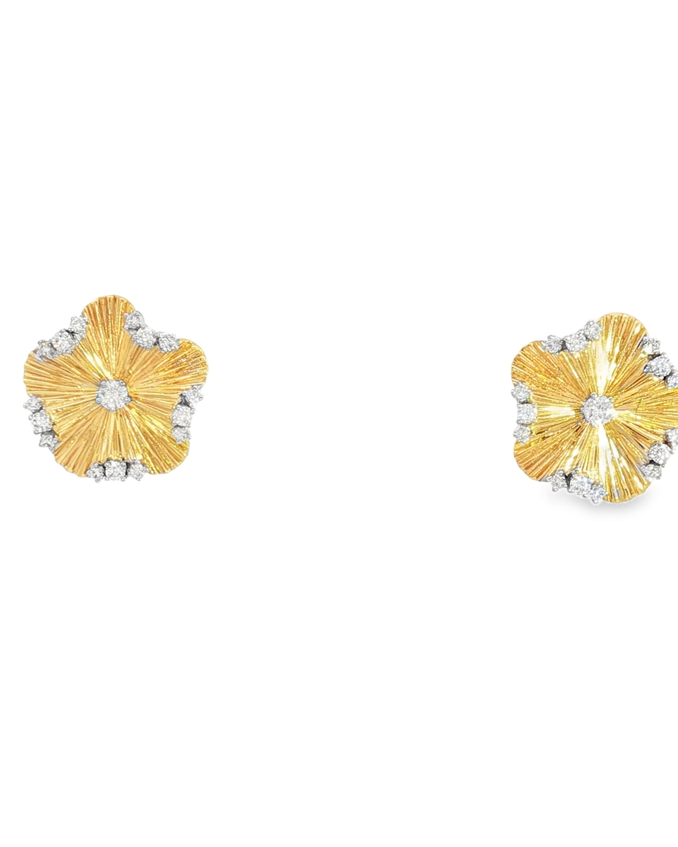 Exquisite Stud Earrings, Crafted In Lustrous Yellow Gold. These Floral-Inspired Jewels Showcase A Central Round Brilliant Cut Diamond, Surrounded By A Halo Of Smaller Diamonds, Enhancing Their Overall Sparkle And Sophistication. A Timeless Addition To Any Fine Jewelry Collection.