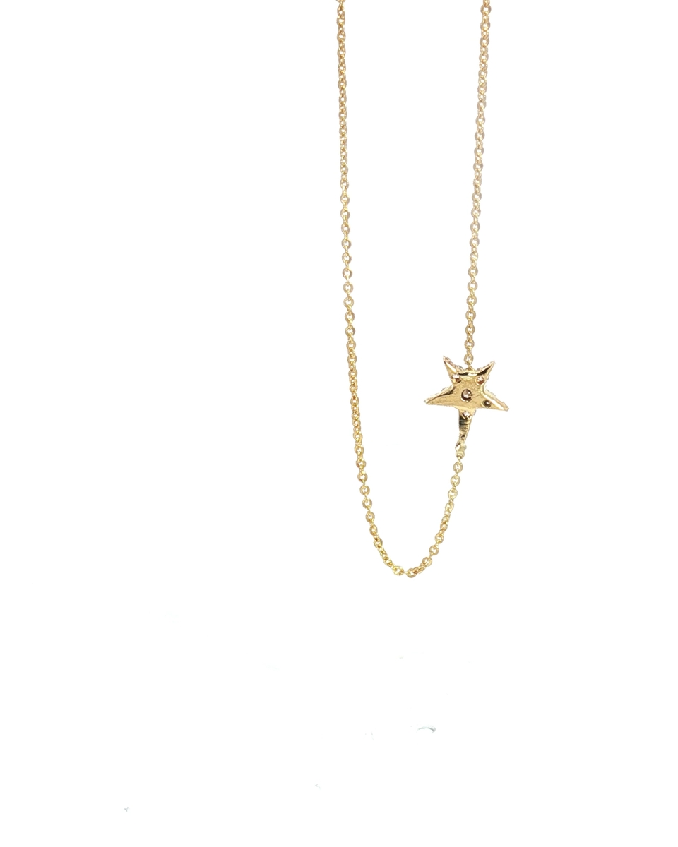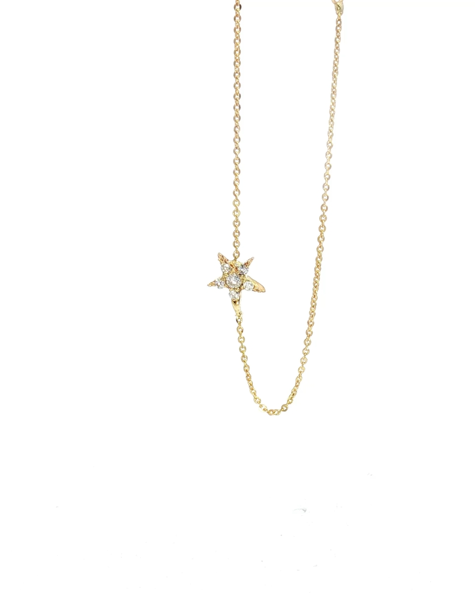 “Elevate your style with this whimsical yellow gold chain bracelet. A star shaped diamond pendant, cut in brilliant style, suspends gracefully. The composition and arrangement of the chain and pendant capture a refined aesthetic, perfect for adding a touch of celestial charm to any ensemble.”