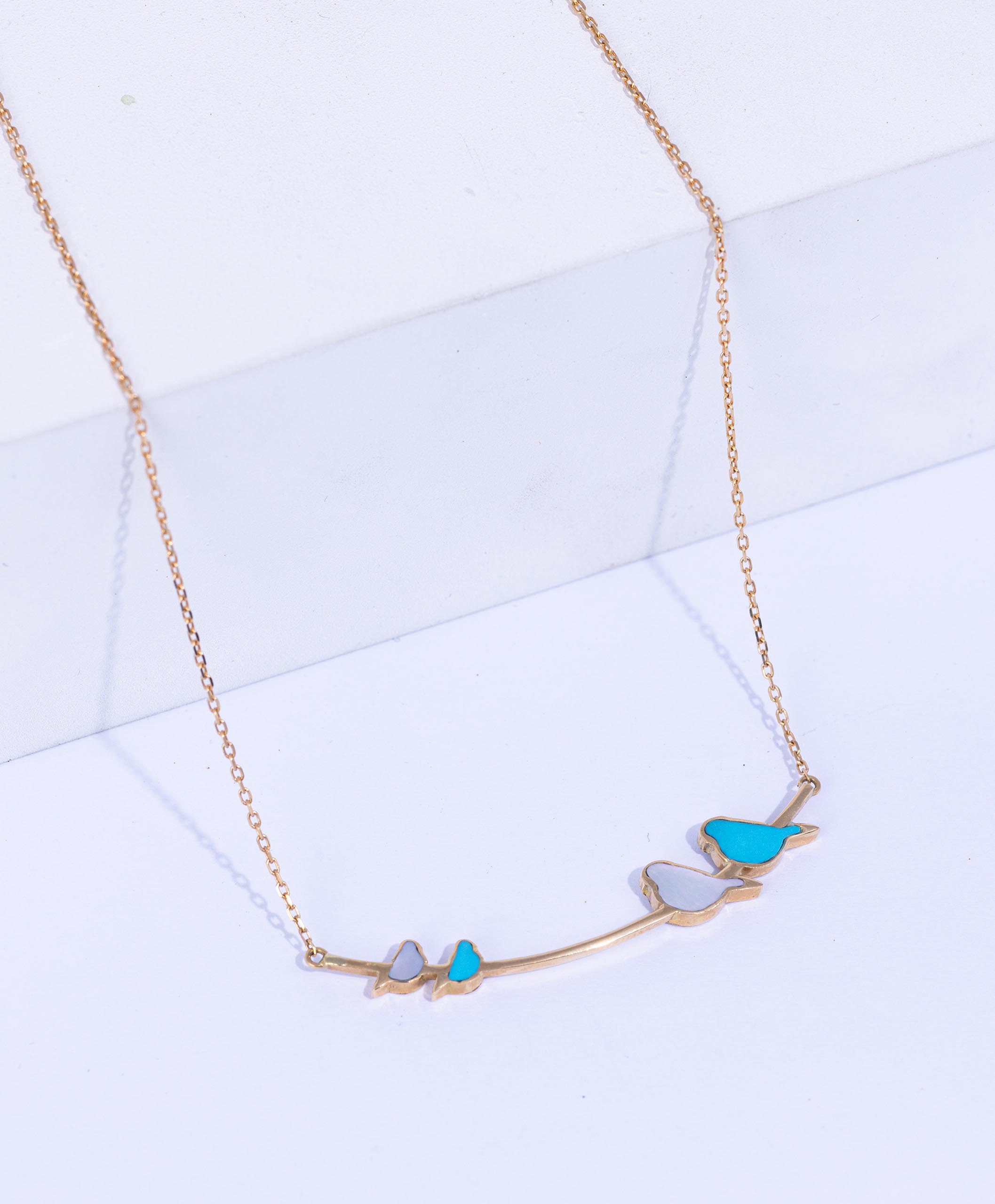 18K YELLOW GOLD BIRDS NECKLACE WITH TURQUOISE, MOTHER OF PEARL