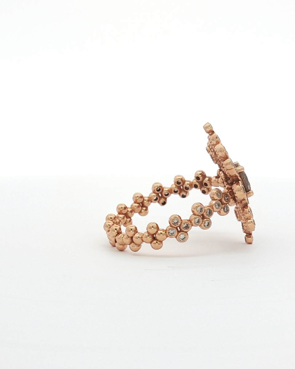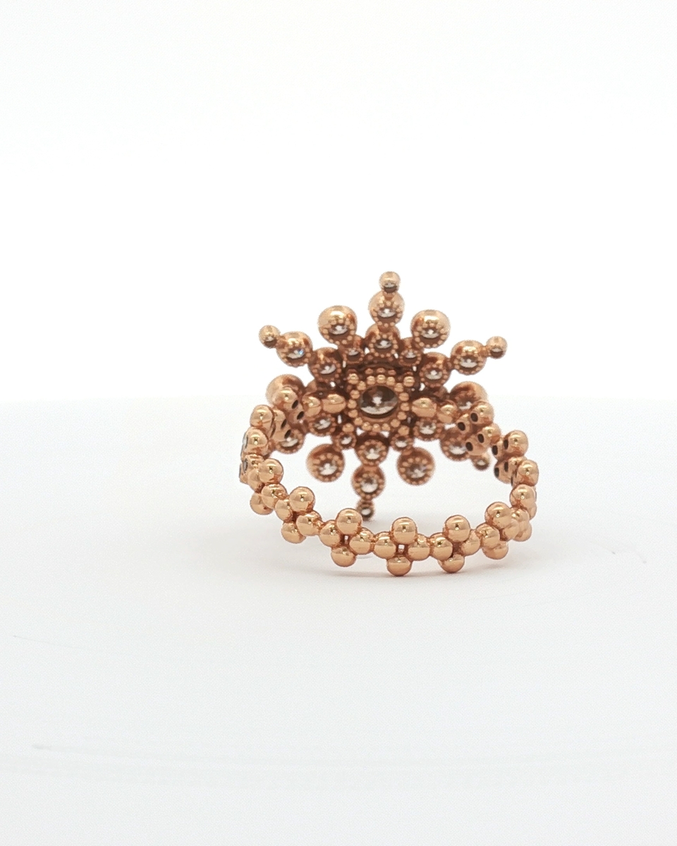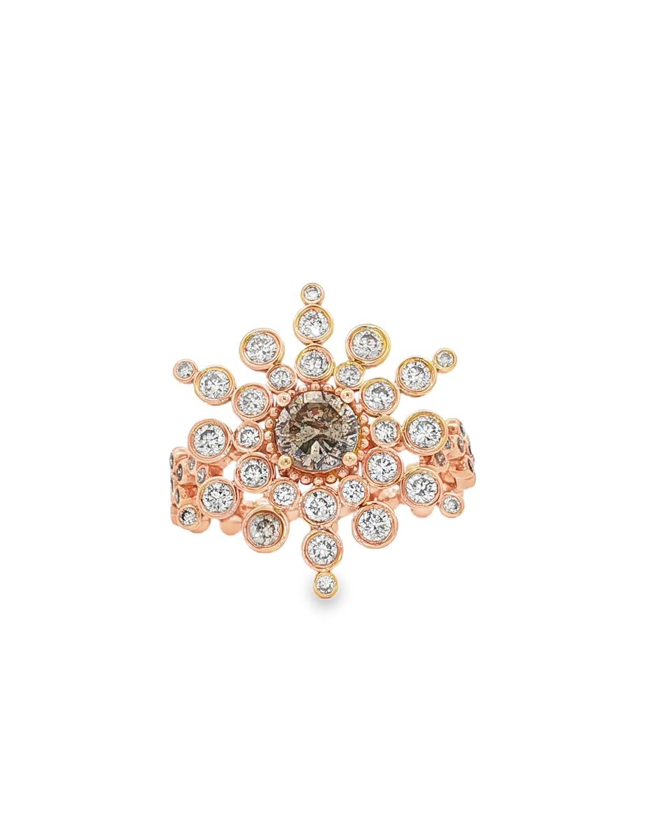 Indulge In The Captivating Allure Of This Exquisite Multistone Ring. Crafted In Radiant Rose Gold, The Design Features A Central Round Cut Diamond Encircled By A Halo Of Smaller Brilliant Cut Diamonds. This Statement Ring Seamlessly Marries Classic Design With Contemporary Flair.
